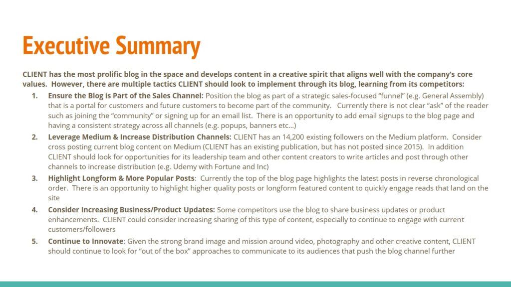 These are often called “Executive Summaries.” One of my first freelance gigs was doing a broad scan of competitor blogs for a learning platform. It was a rushed project but still provides a good example of what I mean by idea simplification. I ended up gathering 32 pages of research and findings.