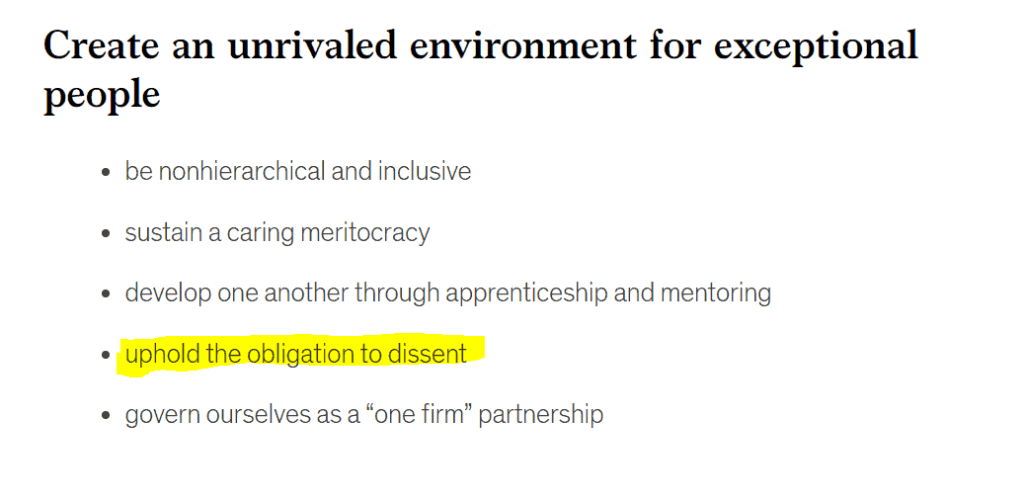 At McKinsey, this is reinforced through a core value: "the obligation to dissent." While many firms have similar intentions, at McKinsey it is part of the day-to-day lived culture. Over and over again, people have seen the benefits of fully committing to the creative process and have trust that the process works. This is why Senior Partners often will ask the most junior people on the team what they think and really want to know.
