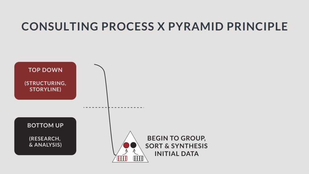 If you are solving a problem using the consulting process, you will leverage the SCQA framework and the Pyramid Principle. In the way I teach students and clients about the consulting process, it involves shifting back and forth between the top-down modes and the bottom-up modes of analysis.