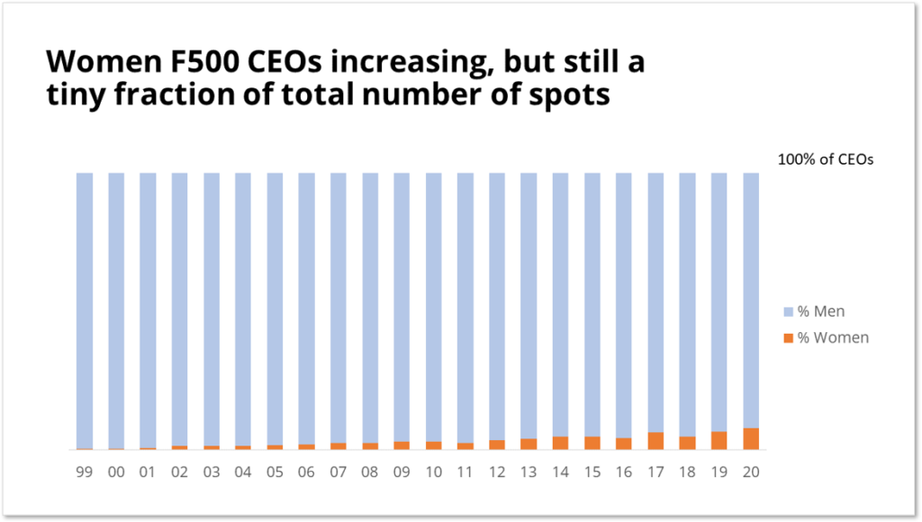 This builds on the last charge and adds the "missing" information of the percentage of men who are Fortune 500 CEOs. This one shows both the increase in the number of women over time while also showing that there is still tremendous progress to be made.