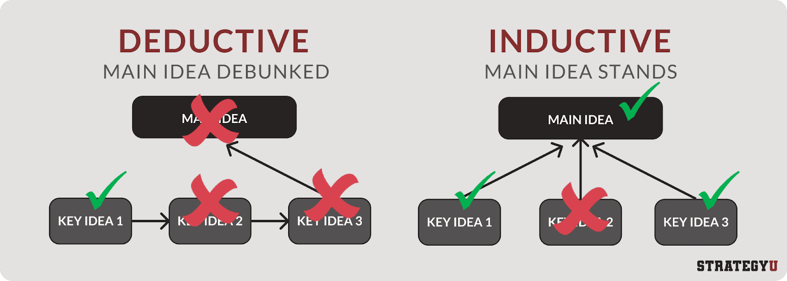 If you are new to this kind of thing you’ll want to start with inductive logic. This is because each individual key idea will support the main idea and if someone challenges and disproves one of your key ideas, the main idea will still be backed up by other arguments. This is in contrast to deductive logic where each of your arguments build upon each other. So as you see in the below argument, if the second key idea is debunked, it undermines the entire argument.