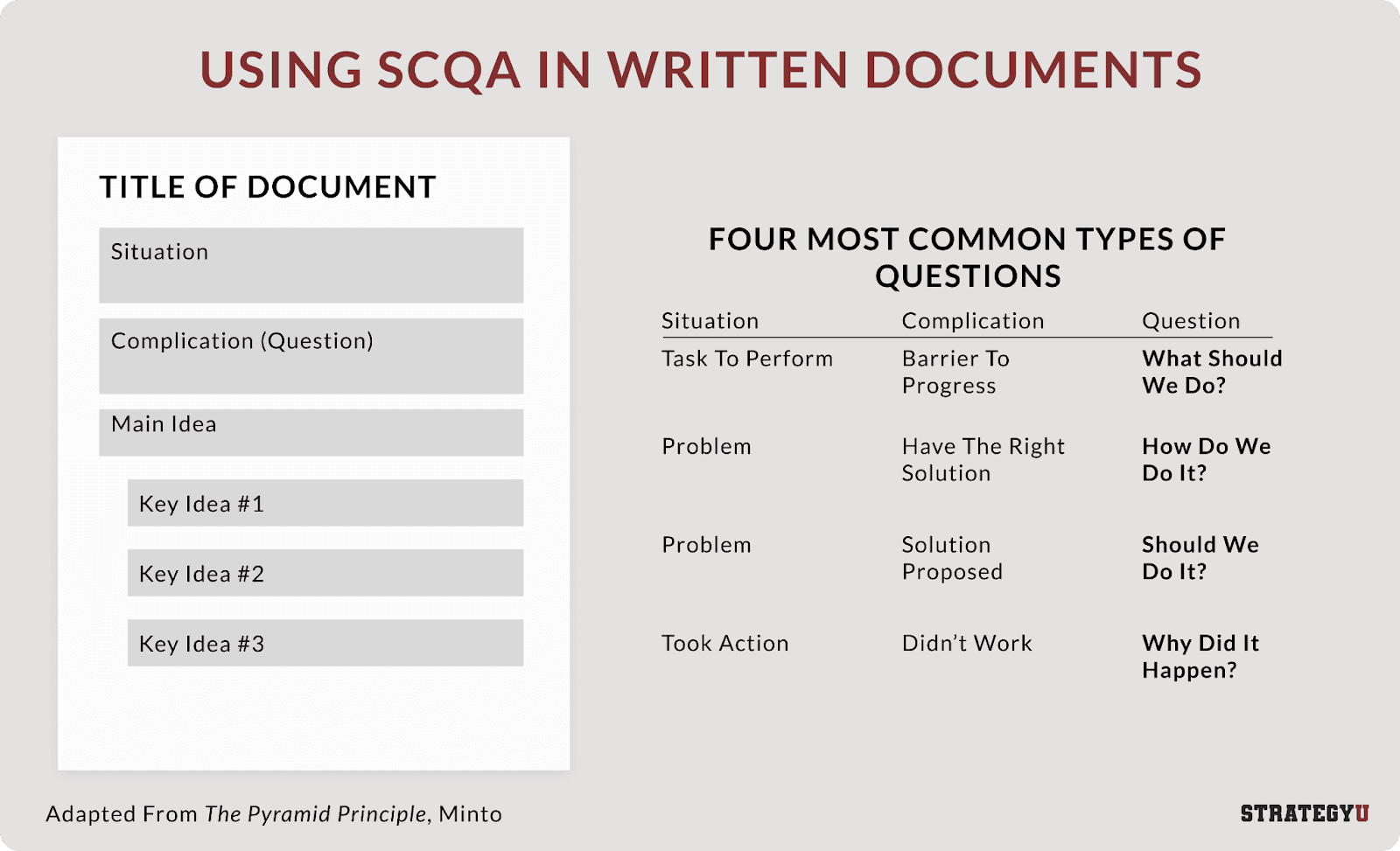Her preferred approach to do this is to use the SCQA approach: Situation, Complication, Question, and Answer. She argues that this “permits you to make sure you and the reader are standing in the same place before you take him by the hand and lead him through your thinking.”