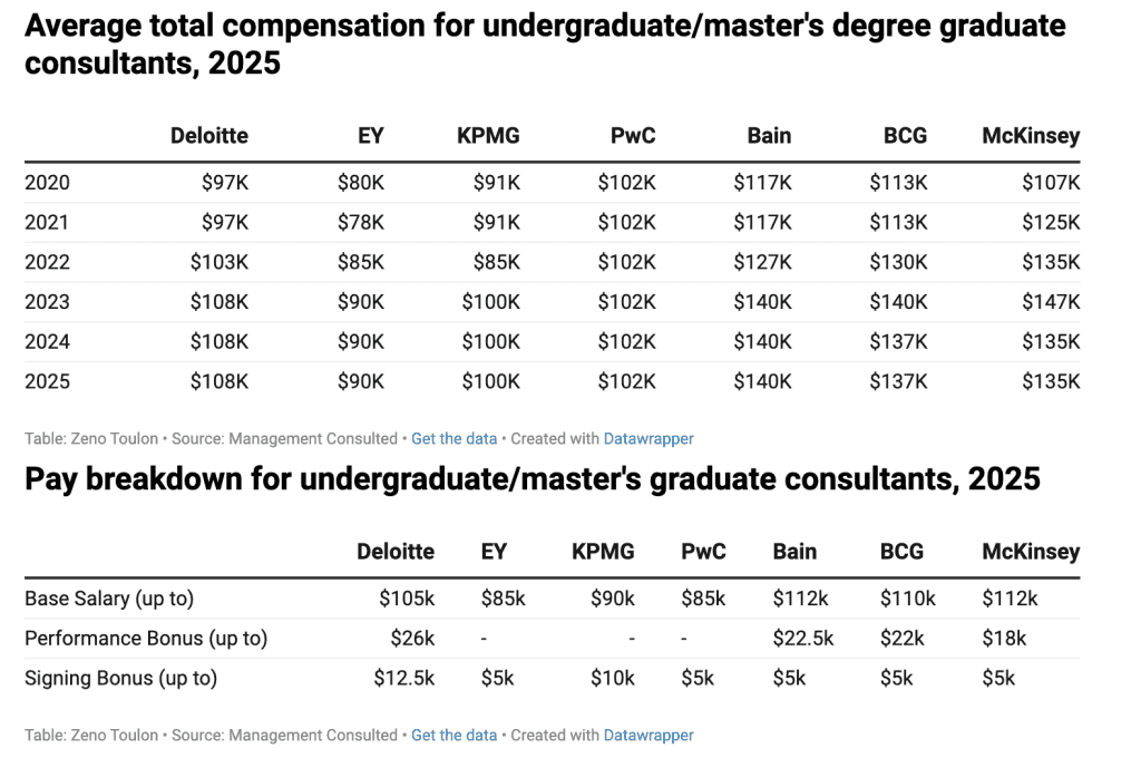 A recent analysis indicates that, as of 2025, an entry‐level consultant at an MBB firm can expect a base salary ranging between \$135,000 and \$140,000 in the United States—figures that have risen noticeably compared to a few years ago. In contrast, consultants at the Big Four accounting firms, which also have extensive consulting arms, are offered lower base salaries in the range of \$90,000 to \$108,000 for similar roles. The disparity is largely driven by performance bonuses; MBB firms typically offer much larger bonus packages, sometimes as much as 25% to 56% higher than those offered by Big Four firms. (eFinancialCareers)