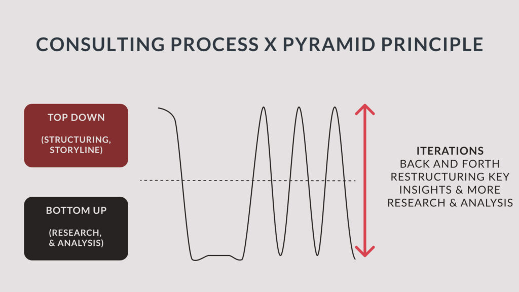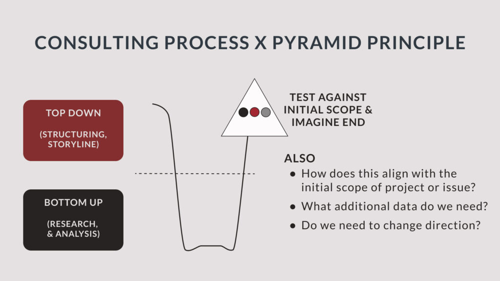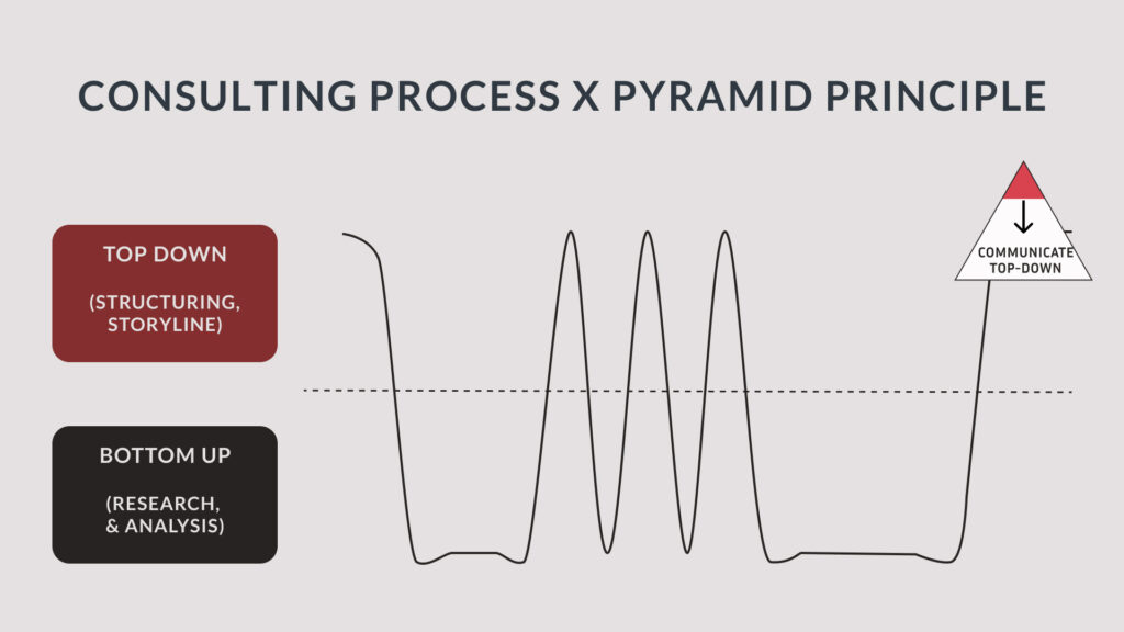 If you are solving a problem using the consulting process, you will leverage the SCQA framework and the Pyramid Principle. In the way I teach students and clients about the consulting process, it involves shifting back and forth between the top-down modes and the bottom-up modes of analysis.
