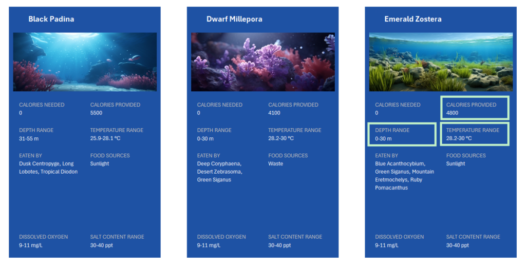 #1 Ecosystem Building: this game involves managing an ecosystem where you need to balance factors like food sources, predators, and environmental conditions to ensure the ecosystem thrives. It tests your strategic thinking and ability to manage complex, interconnected variables. Check out the picture below to realize how species are presented in the game: