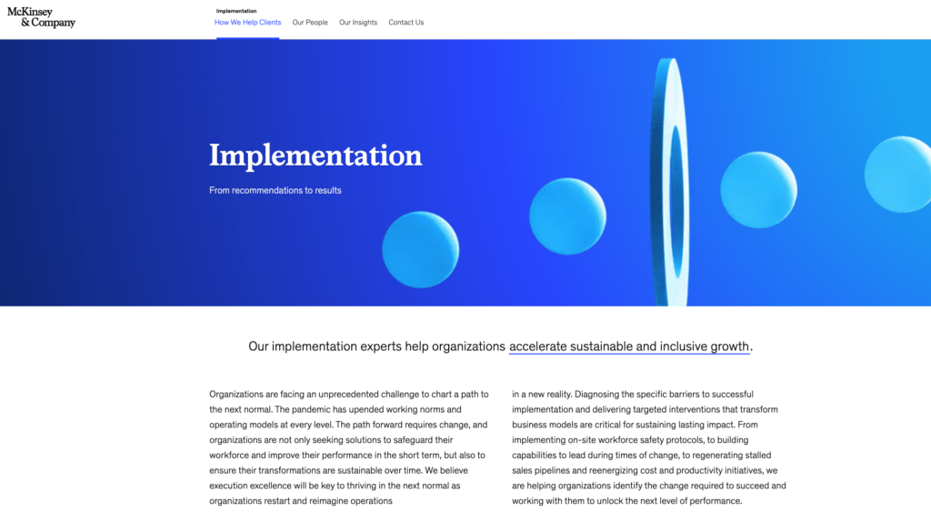 The reality for any consulting firm today is that clients demand some skin in the game and a commitment to go “beyond the deck” to actual implementation and execution. I worked in the operations practice while at McKinsey from 2008 to 2010 and the typical engagements were years long. Different teams might rotate through the project but the teams were aligned against a multi-year transformation effort. In recent years, these firms have even added dedicated implementation teams, different groups that get put on site for longer than three months.